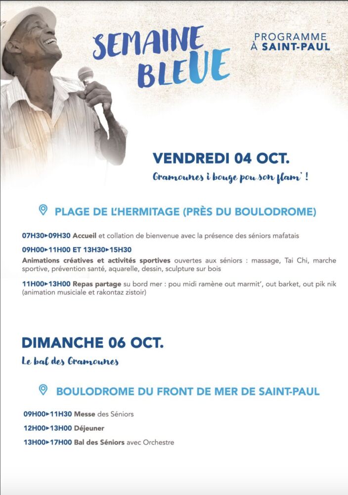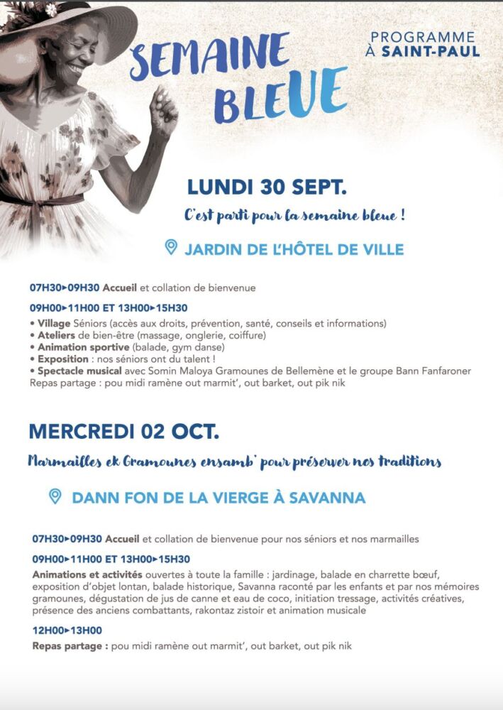 L’événement débutera officiellement lundi 30 septembre au Jardin de la Mairie, avant de laisser place à une journée intergénérationnelle le mercredi 2 octobre à Savanna, réunissant jeunes et aînés autour d’activités conviviales. Le vendredi 4 octobre, les gramounes profiteront d’un pique-nique en bord de mer à l’Ermitage, avant de clôturer en beauté le dimanche 6 octobre avec une messe suivie d’un bal festif.