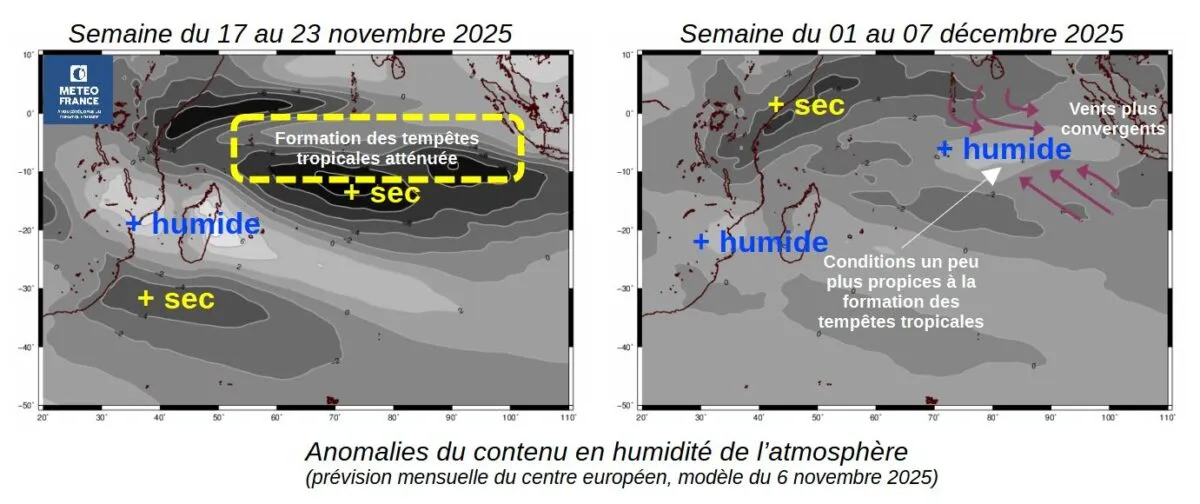 Pour la semaine du 17 au 23 novembre, l’atmosphère s’annonce particulièrement humide sur une large partie du bassin, alors que les zones situées plus au nord connaîtront des conditions plus sèches. En revanche, à partir de début décembre, les tendances inversent : un temps plus sec s’installera à Mayotte et, dans une moindre mesure, à La Réunion. Toutefois, les modèles prévoient une légère reprise de l’humidité sur la partie est du bassin, laissant entrevoir des conditions un peu plus propices à la formation de tempêtes tropicales.