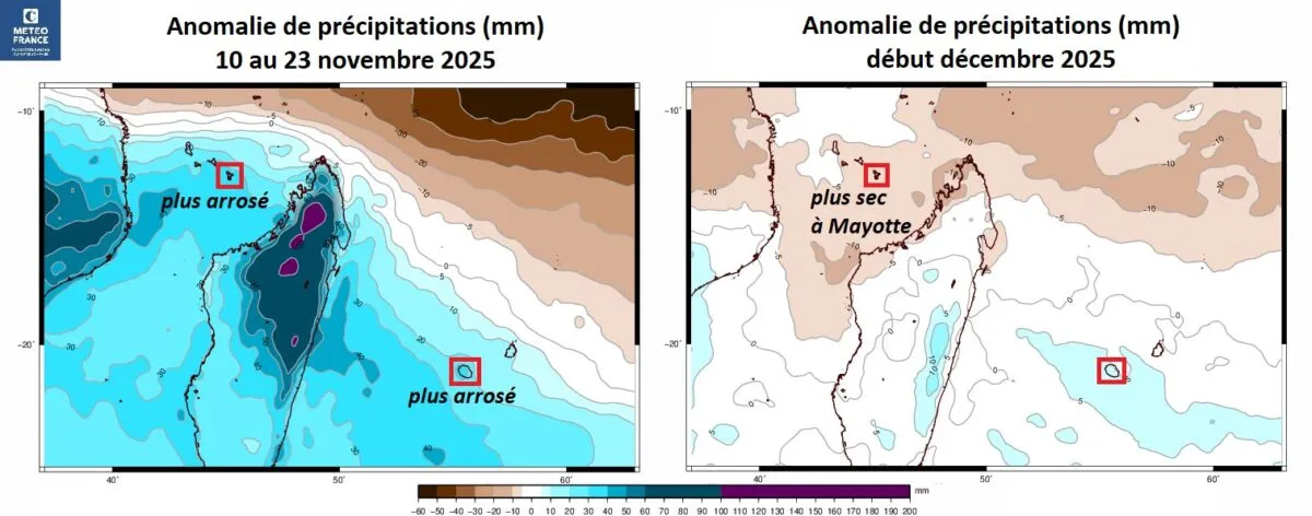 Les cartes publiées par Météo France montrent que du 10 au 23 novembre 2025, le sud-ouest de l’océan Indien – incluant La Réunion – devrait être davantage arrosé, contrairement à Mayotte où les conditions resteront relativement sèches. Ce regain d’humidité s’explique par la mise en place d’une masse d’air plus chaude et plus humide dans la région, associée à des flux favorisant la formation de nuages et d’averses, notamment sur les reliefs.