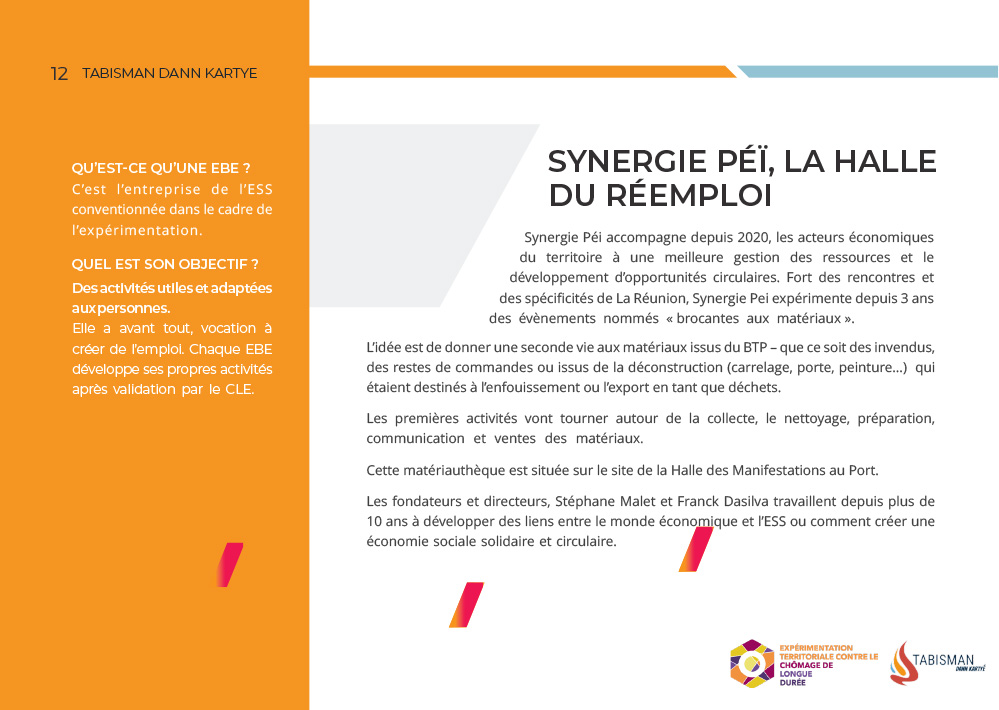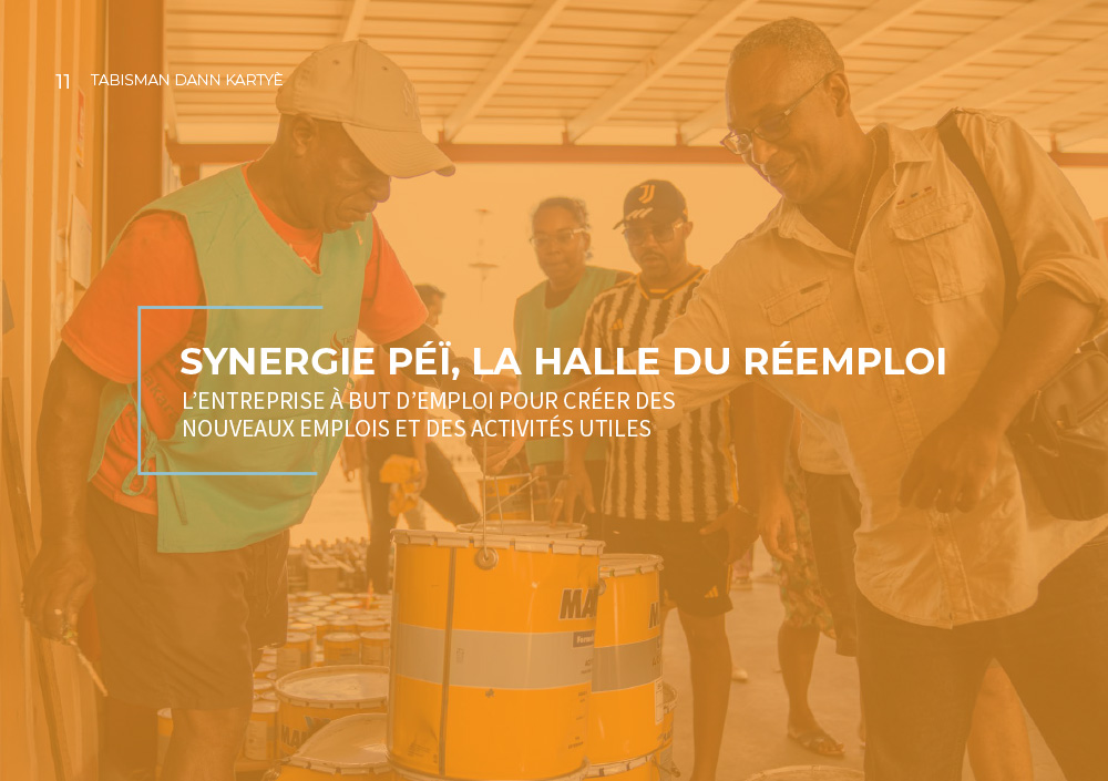 Ainsi, en décembre 2023, l’EBE portée par Synergie Péï , engagée dans des activités de recyclage et d’économie circulaire, a été conventionnée pour créer des emplois en CDI à temps choisis et pour ce faire, des activités utiles et non concurrentielles pour le territoire. Au sein de l’EBE, plusieurs pôles d’activités ont vu le jour pour valoriser et développer les compétences des salariés. Parmi eux : la brocante aux matériaux, la friperie, l’atelier menuiserie et la petite logistique.