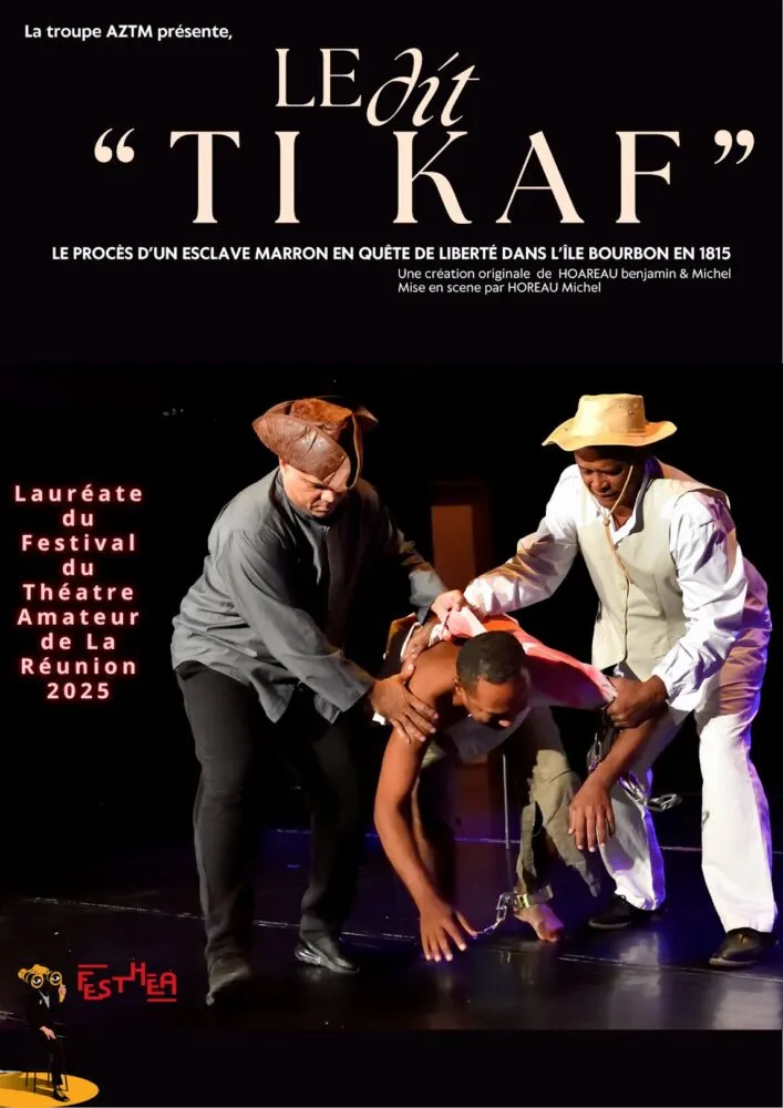 La pièce « Le Dit Ti-Kaf », écrite par Benjamin et Michel Hoareau et mise en scène par Michel Hoareau, plonge le spectateur dans l’île Bourbon (La Réunion) de 1815. À travers le procès d’un esclave marron, la pièce interroge la mémoire, la dignité et la résistance, mêlant langue créole, chants, percussions et théâtre poétique.