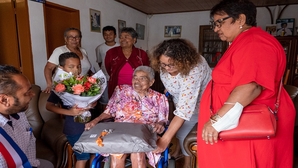 Suite à la fin de la Semaine Bleue, la Ville de Saint-Paul continue les visites de ses centenaires. C’est à Bois-de-Nèfles que Thérèse Ariçis Cuvelier, 100 ans, reçoit avec surprise la visite de l’Adjoint de quartier, Yann Crighton.
