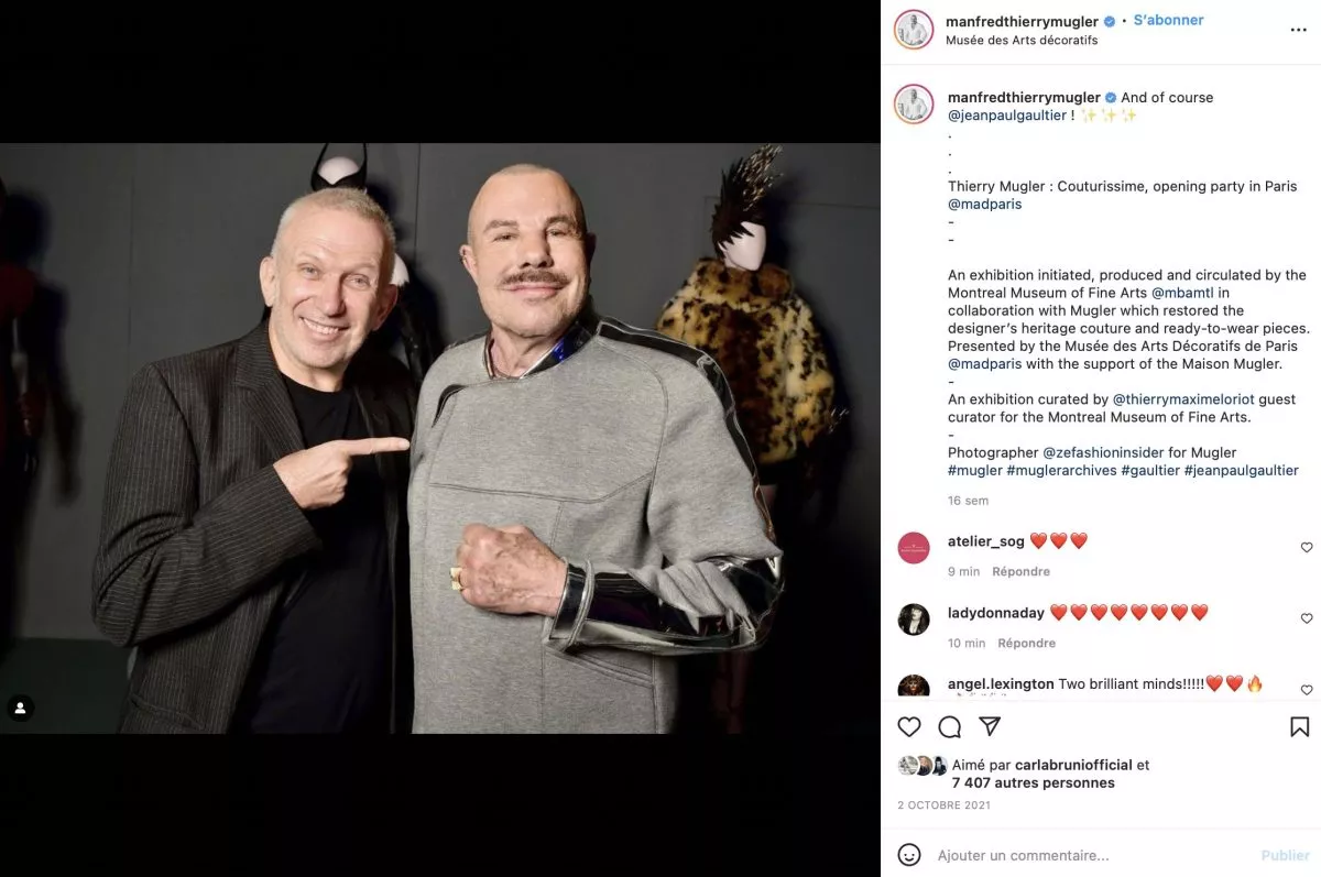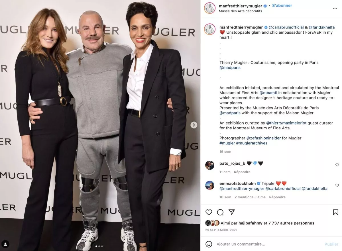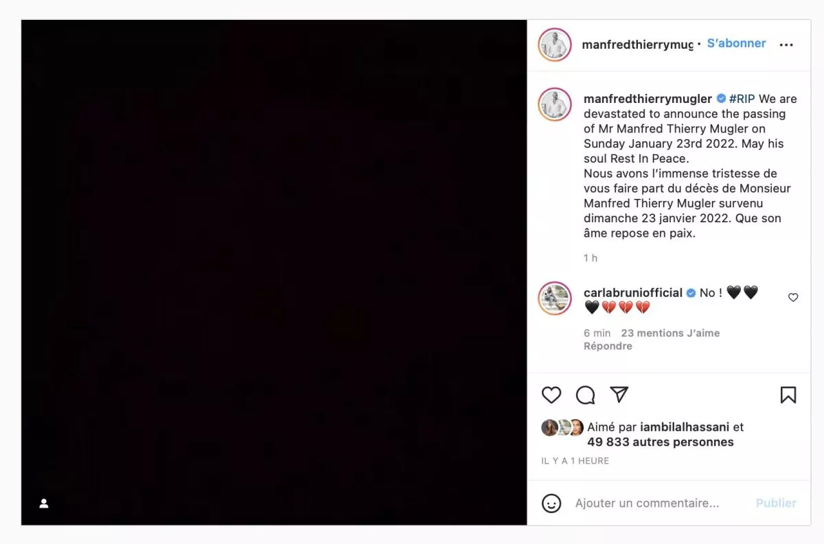 Une annonce postée sur son compte Facebook et Instagram: “Nous avons l’immense tristesse de vous faire part du décès de Monsieur Manfred Thierry Mugler survenu dimanche 23 janvier 2022. Que son âme repose en paix”.