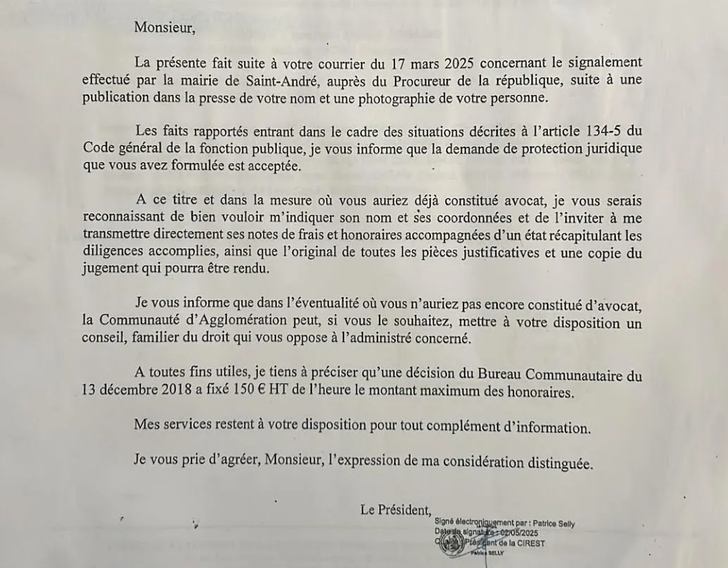 Ledit collaborateur, qui avait auparavant servi l’ancien président de la Cinor, peut dormir sur ses deux oreilles. Il n’aura pas à débourser pour ses frais de justice. La Cirest a accepté sa demande de protection juridique. Document ci-dessus que nous avons volontairement recadré pour éviter de jeter des noms en pâture.