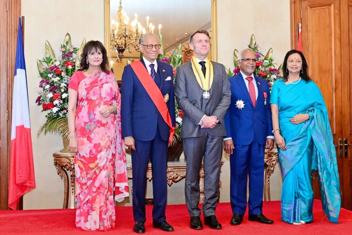De gauche à droite : l’épouse du Premier ministre mauricien, le Premier ministre Dr Navin Ramgoolam, Emmanuel Macron, le président mauricien Dharam Gokhool et son épouse.