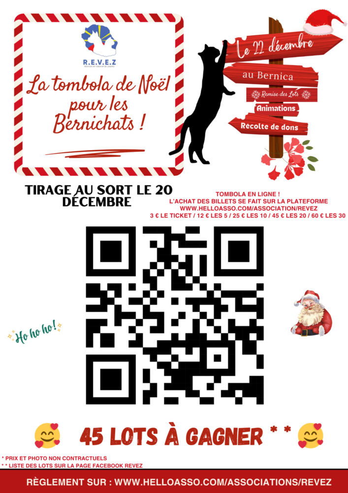 REVEZ est ravie d’annoncer le lancement de sa tombola de noël, un événement festif qui se déroulera jusqu’au 20 décembre2024. Cette tombola a pour but de récolter des fonds pour prendre soin des 45 chats encore sous la protection de l’association.