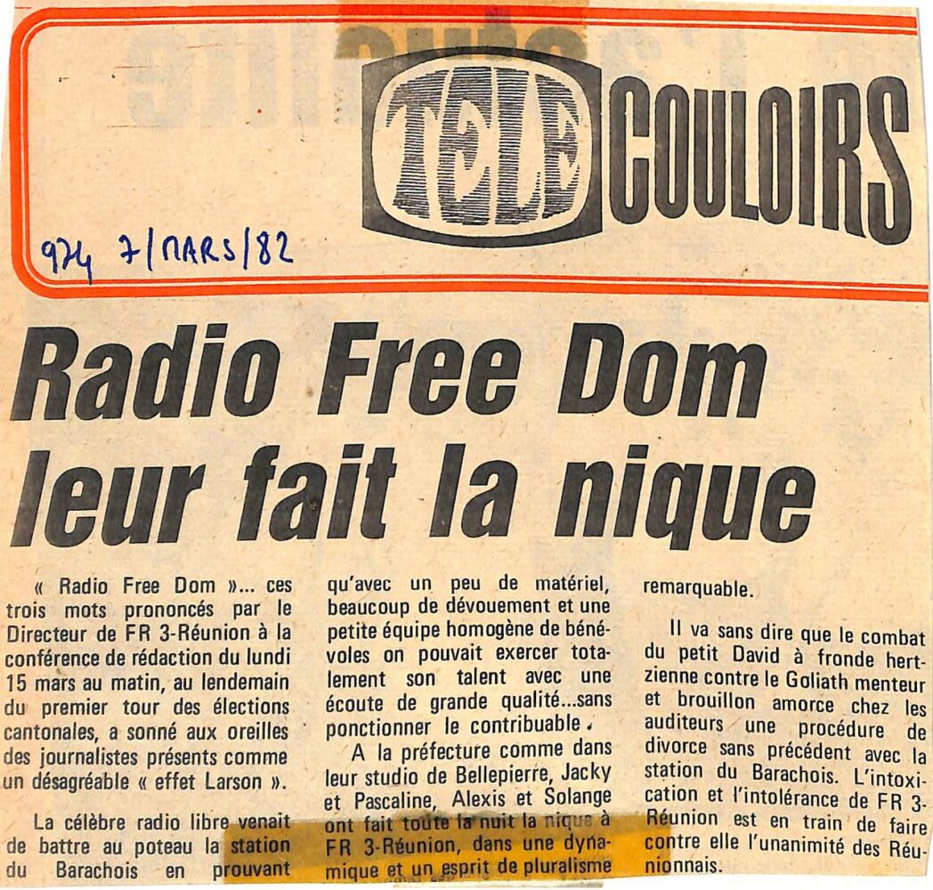 1982 « Toute la nuit Radio Free Dom fait la nique à FR3 » par La Rédaction 7 mars 1982 1 min de lecture « Toute la nuit Radio Free Dom fait la nique à FR3 » avec Jacky, Pascaline, Alexis et Solange (couverture des cantonales). Une coquille : Il est écrit « l’effet Larson » (comme le bouillon) au lieu de l’effet « larsen » ! Ne manquez pas toute l’actualité de La Réunion ! Abonnez-vous à la newsletter de Free Dom ! Valider Partager Facebook Twitter Pinterest Linkedin Whatsapp Reddit Email Vous pourriez être intéressé par 10 décembre 1982 Un canular par jour sur Radio Free Dom 11 octobre 1982 L’émission « pas de canard sans navet » 7 octobre 1982 L’émission « bleu outre-mer ou la radio de la méduse… » La Rédaction Laisser un commentaire Annuler la réponseYour email address will not be published. Enregistrer mon nom, mon e-mail et mon site dans le navigateur pour mon prochain commentaire. Current ye@r * Leave this field empty Article précédent Pour légaliser les radios libres, on crée une commission ! Article suivant Nouvelle soirée dansante au « Mi Amuse » de Saint-André avec les fameuses « Free Dom Girls » Articles récents... Hommage à Johnny Hallyday sur Free Dom 2 ce 5 décembre Mardi 30 décembre 2025 – Météo, éphéméride et horoscope du jour Saint-Joseph : découverte de 2337 plants de cannabis, arrestation de 2 individus Point sur le réseau routier départemental, 29 décembre à 16H30 Suicide sur le pont de la Rivière d’Abord : importante mobilisation des secours et des forces de l’ordre Radier submergé à Ilet Furcy : la route de Cilaos fermée à la circulation cette nuit Fortes pluies : appel à la plus grande prudence à Saint-Paul Saint-Gilles-les-Bains : une route impraticable, les riverains montent au créneau (VIDEOS) Très grands excès de vitesse : un délit passible de prison depuis le 29 décembre 2025 Fermeture temporaire du sentier de la Canalisation des Orangers (cirque de Mafate)