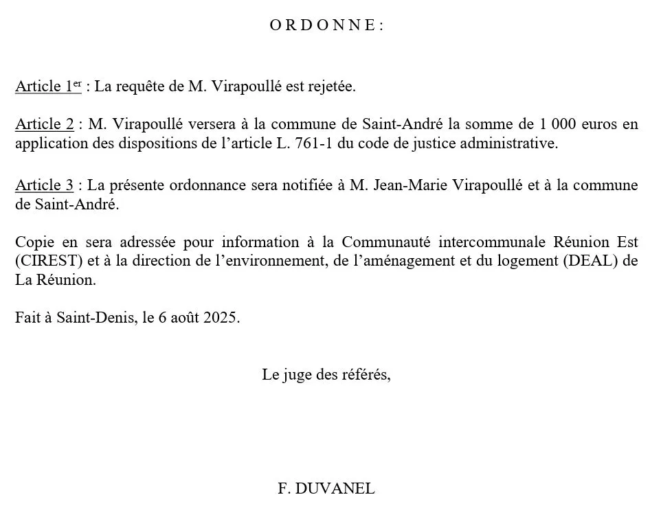 La municipalité, via son maire Joé Bédier, a aussitôt réagi. « La commune de Saint-André prend acte de la décision du juge des référés du Tribunal administratif, qui a rejeté sans ambiguïté la requête de M. Jean-Marie Virapoullé, visant à suspendre les travaux de requalification de l’Avenue de l’Île-de-France.