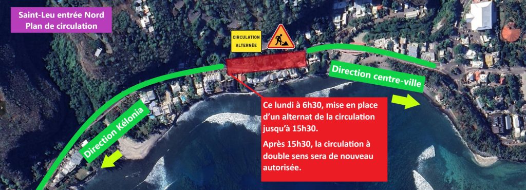 L’atelier situé à l’entrée nord de la ville reste inchangé. Ainsi, dès lundi à 6h30, le chantier à l’entrée Nord de Saint-Leu reprendra avec la mise en place d’un alternat de la circulation jusqu’à 15h30.