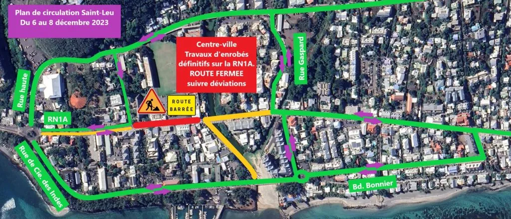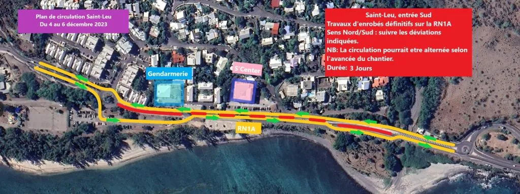 Du lundi 4 au mercredi 6 décembre, un atelier d’enrobé définitif aura lieu à l’entrée Sud sur la RN1A. La circulation sera modifiée dans le sens Nord/Sud, avec des déviations à suivre. Selon l’avancée des travaux, un alternat de circulation sera mis en place.