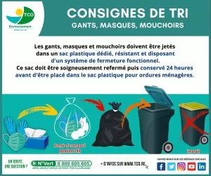 Les déchets potentiellement infectés (gants, masques, mouchoirs…) vont toujours dans le bac bleu. Jamais dans le bac jaune !