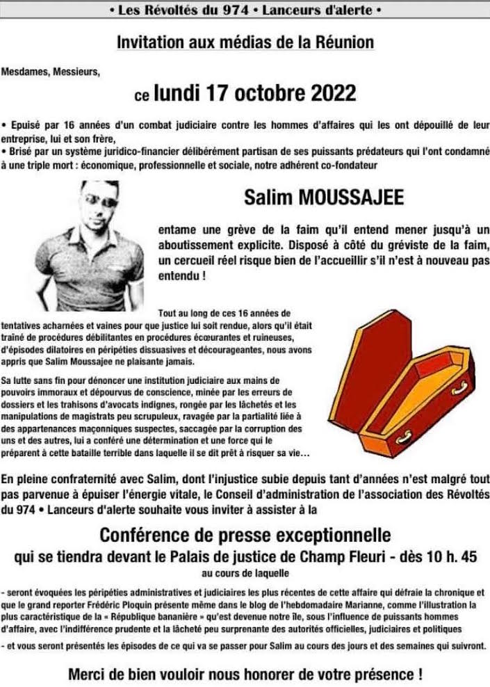 De par cette action, Salim Moussajee qui ne cesse de « réclamer justice », espère qu’il sera cette fois-ci entendu. Il se bat concernant notamment une affaire qui a déjà fait l’objet de plusieurs dizaines de procès judiciaires et donné lieu de à de multiples reportages, y compris dans la presse nationale dont certains grands titres n’avaient d’ailleurs pas hésité à parler de « scandale judiciaire ». Salim Moussajee est soutenu localement par le Collectif « Les Révoltés du 974 ».