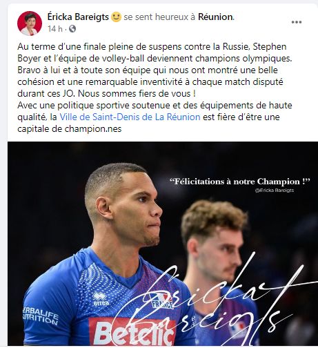 J’adresse mes sincères félicitations à Fanny Horta, Caroline Drouin, Guillaume Chaine, Stephen Boyer, Donovan Grondin et Melvin Richardson, réunionnais médaillés des jeux olympiques de Tokyo.