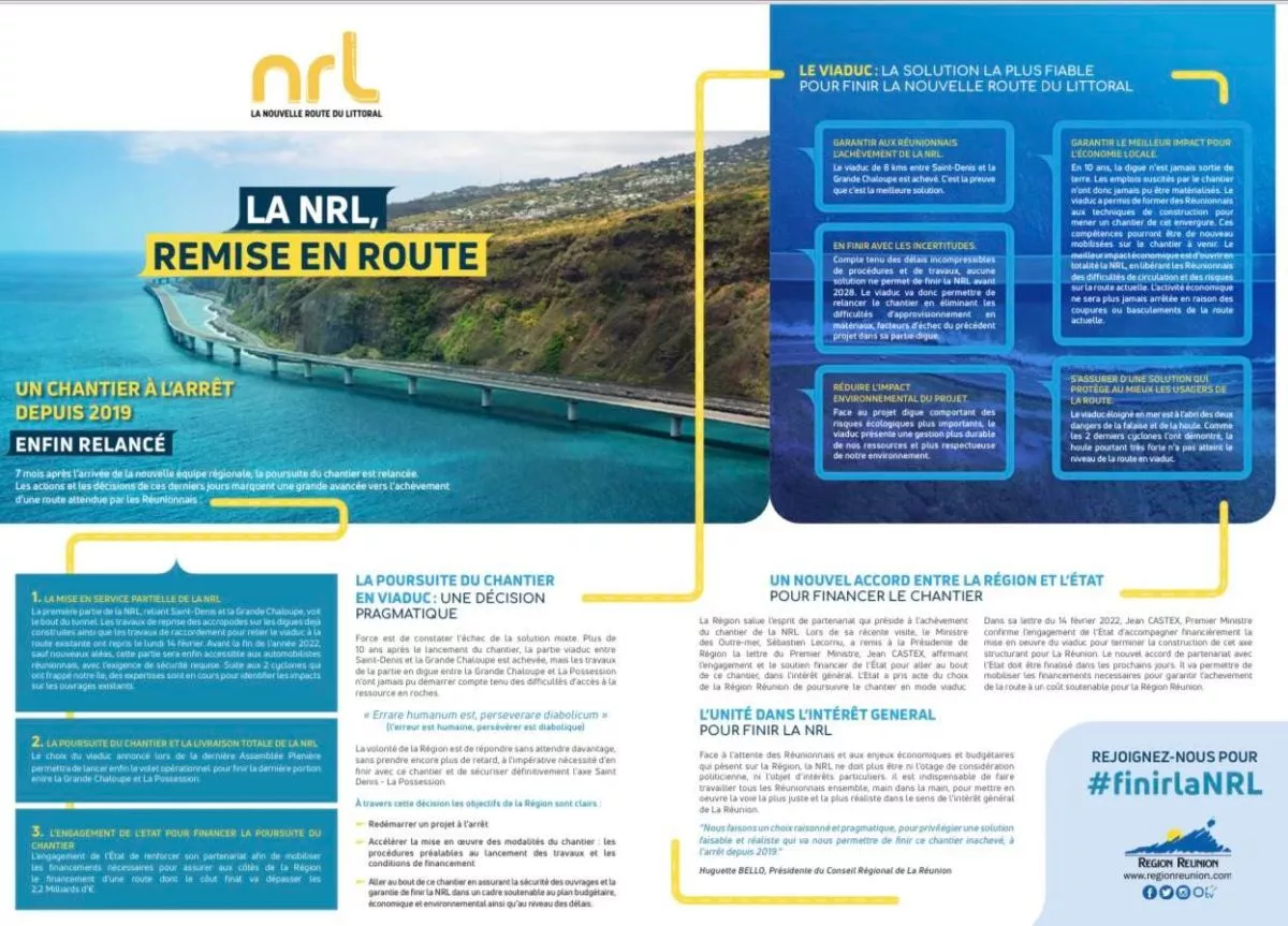 Ce dernier inaugure le 30 mars 2021 (trois mois avant les élections régionales) un viaduc reposant sur 48 piliers, réalisé par les multinationales (que certains appelleront la DRL ou Demi Route du Littoral), mais il restera un peu moins de 3 kilomètres à réaliser pour terminer entièrement la NRL. Didier Robert avait opté pour 2,5 km de digue. Sauf que la carrière de Bois Blanc n’a jamais pu être ouverte et, faute de roches massives et de signature de plan andains, cette partie est toujours inachevée.
