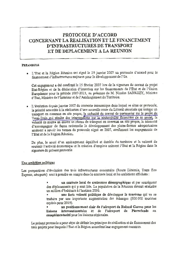 Pour la NRL, il y a eu « l’accord de Matignon 1 », appelé également « Protocole de Matignon » ou encore, tout simplement « Matignon ». Des accords signés un 19 janvier 2007 par le Premier ministre, Dominique de Villepin, et par le président du conseil régional de la Réunion, Paul Vergès. Ce fut un moment solennel auquel avaient assisté des élus de droite parmi lesquels le député René-Paul Victoria ou encore Jean-Louis Lagourgue. Un accord portant sur la réalisation et le financement d’une nouvelle route littorale sécurisée ainsi que d’un tram-train. Soit 930 millions d’euros (dont 394 millions d’euros de l’Etat) pour la route et 1,31 milliard d’euros (dont 435 millions d’euros de l’Etat) pour le premier tronçon du tram-train,