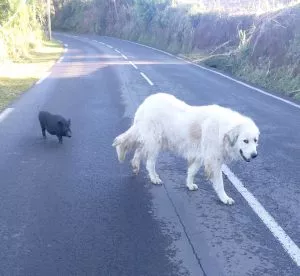 Tôt ce matin, un chien suivi d’un petit cochon ont été signalés pendant leur balade sur la route en direction vers