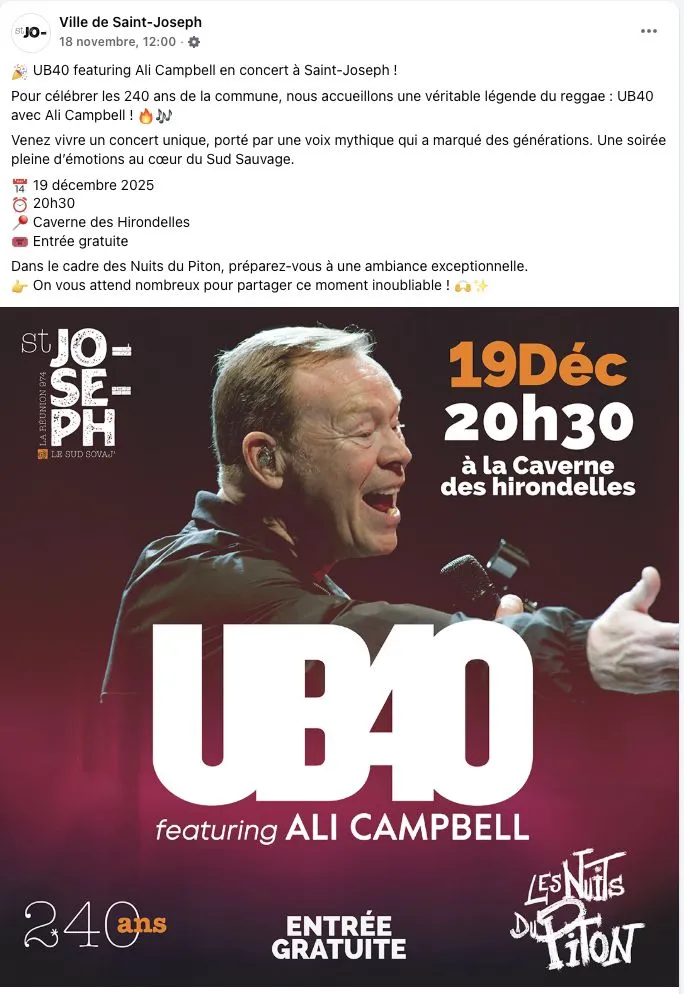 La municipalité de Saint-Joseph offrira gratuitement à la population un concert du célèbre groupe UB40 le 19 décembre. Une belle initiative culturelle pour la commune, mais il est utile de se pencher sur les coulisses : les coûts engagés pour faire venir un tel artiste.