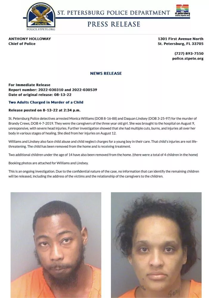 En Floride, à Saint-Pétersbourg, Monica Williams, 33 ans, et Daquan Lindsey, 24 ans, sont accusés de maltraitance et de meurtre après le décès de leur fille, Brandy Crews, âgée de 3 ans. Ils auraient à nouveau jeté leur petite fille contre un mur la semaine dernière à plusieurs reprises, selon la police.