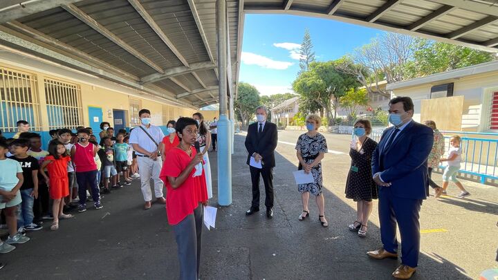 Le préfet , la maire Ericka Bareigts, et la rectrice à l’école Henri Dunant à St-Denis