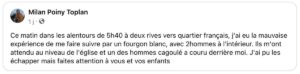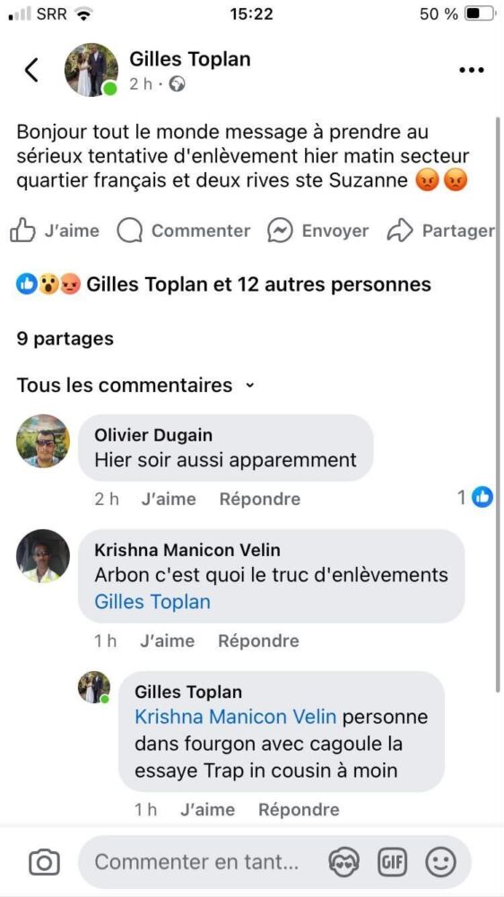 Hier matin, aux alentours de 5h40, dans le quartier des deux rives près du quartier français à Sainte-Suzanne, un homme a vécu une expérience troublante et inquiétante. Alors qu’il se déplaçait, il a remarqué qu’un fourgon blanc le suivait. À l’intérieur du véhicule, se trouvaient deux hommes. Le fourgon a attendu près de l’église et l’un des hommes, portant une cagoule, est sorti du véhicule et a commencé à courir derrière lui. Heureusement, l’homme a réussi à s’échapper sans être rattrapé.