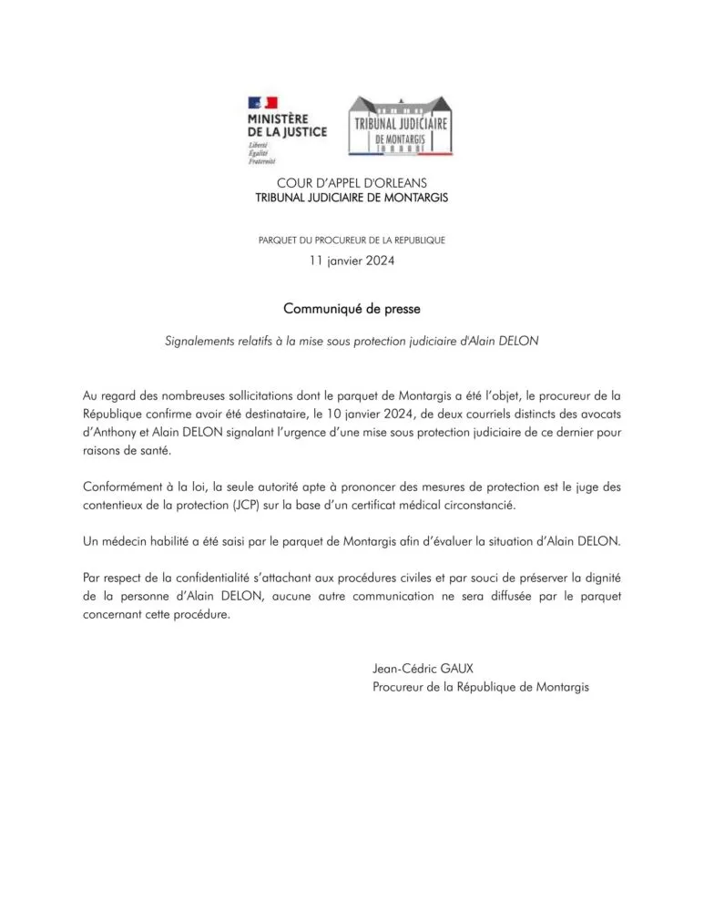 Un médecin habilité a été saisi par le parquet de Montargis afin d’évaluer la situation d’Alain DELON. Par respect de la confidentialité attachée aux procédures civiles et par souci de préserver la dignité de la personne d’Alain DELON, aucune autre communication ne sera diffusée par le parquet concernant cette procédure.