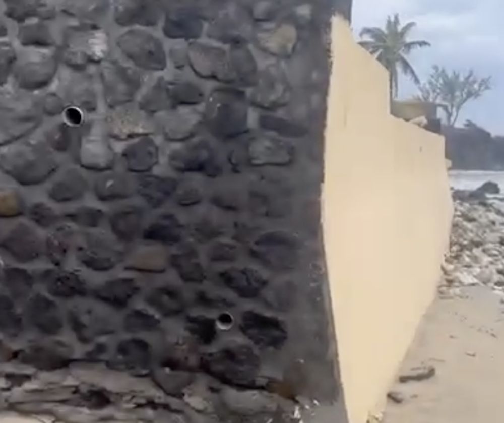 En cette fin de journée, et alors que le cyclone tropical intense Belal n’a même pas encore frappé l’île, un mur s’est effondré aux Aigrettes, à Saint Gilles, sous les assauts de la houle. Le mur fait face au spot de surf.