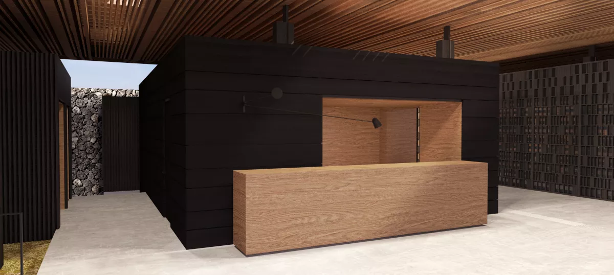Une toiture monumentale végétalisée avec une structure en bois apparente vient couvrir ces espaces sous laquelle se détachent des « boîtes » en bois brulé accueillant la réception.