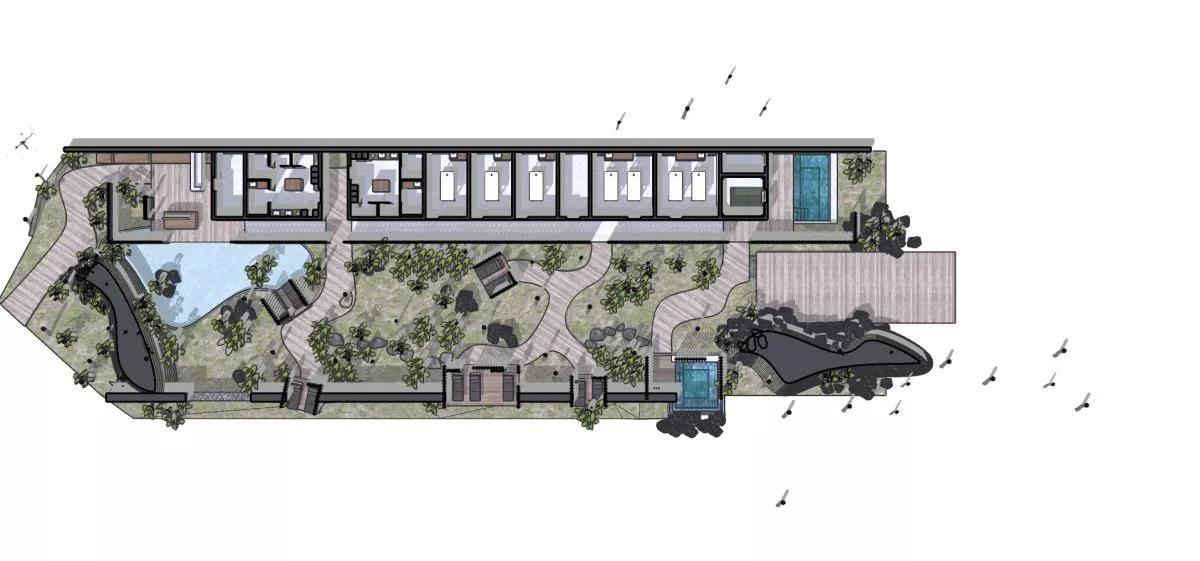 Un SPA composé d’un bâtiment en longueur également à toiture végétalisée, des larges terrasses et de cinq kiosques en bois indépendants incrustés dans un mur de pierre de lave. Le SPA est au cœur d’un espace planté tropicale verdoyant, agrémenté́ de fontaines, le lieu se veut au milieu de la nature, protégé́ et ombragé, à part…pour offrir des soins et massages d’exception hors du temps, hammam, jacuzzis, espaces détente, un lieu accessible aux non-résidents.