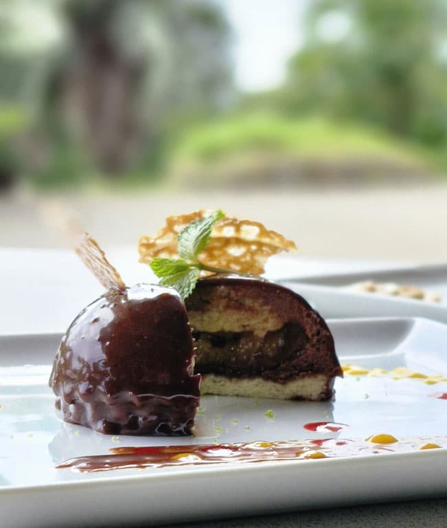 Pour terminer un fin glaçage chocolat noir et zeste de combava permet d’apporter de la brillance et une note originale au dessert. Une fine tuile vient se poser au sommet du dôme qui apporte du relief à cette pâtisserie et sa splendeur qu’elle mérite. » Jean-Jacques Nany