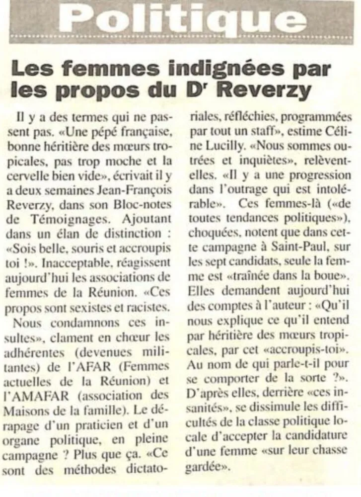 • Il est cupide pour quoi? Pour s’acheter un cercueil en or! Soyez cohérent! Il n’a plus besoin d’argent à son âge et c’est par manque de médecins que beaucoup de vieux continuent à travailler! En France, il y a les déserts médicaux et nous avons cette chance de ne pas encore être grandement impactés! Il y a des fous qui se baladent à la Réunion et ils ont besoin d’un traitement! Quand ce psychiatre cessera ses activités et qu’un drame arrivera, vous penserez fort à Reversy! Pendant ce temps, les vrais délinquants qui commettent des délits dans les mairies, dans les administrations courent toujours. Une histoire montée de toutes pièces pour porter le discrédit. L’Est est la région la plus délaissée : pénurie d’eau, manque d’infrastructures, manque de tout!