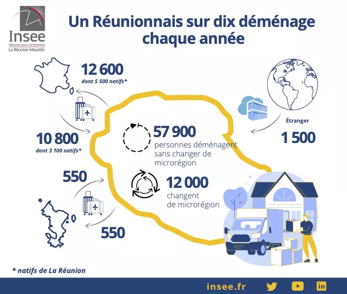 Chaque année en moyenne entre 2015 et 2019, un habitant sur dix de La Réunion déménage. Les deux tiers des déménagements se font dans la même microrégion de l’île. Comme ailleurs, les jeunes de moins de 30 ans sont les plus mobiles et contribuent le plus à la mobilité longue distance vers la France métropolitaine. Les départs vers la métropole sont un peu plus nombreux que les arrivées en raison des départs de jeunes « sautant la mer » pour poursuivre leurs études. Le solde des migrations avec la métropole se creuse par rapport à la première moitié des années 2010. Dans le même temps, les départs et arrivées d’actifs en emploi ou au chômage s’équilibrent. Les natifs de La Réunion ne sont à l’origine que d’une minorité des migrations avec la métropole : trois arrivées sur dix et quatre départs sur dix. Quant aux migrations internes à l’île, le Nord est la microrégion la plus attractive, notamment pour les étudiants et les actifs. C’est aussi celle qui génère les flux de départs et d’arrivées les plus importants, au contraire du Sud où les arrivées compensent les départs. De leur côté, l’Ouest et dans une moindre mesure l’Est perdent des habitants à l’issue de ces migrations.