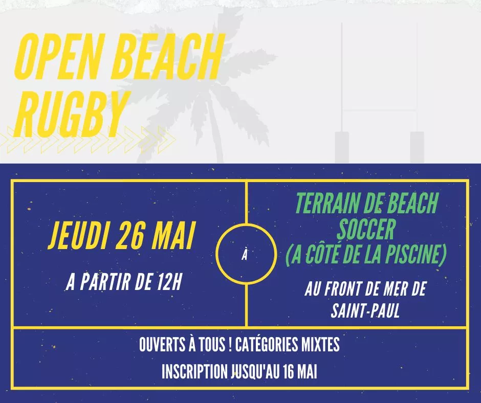 - Open Beach Rugby (à partir de 12h au Terrain de Beach Soccer, front de mer de Saint-Paul) : Le tournoi Beach Rugby est de retour le jeudi 26 mai ! On se retrouve au terrain de Beach Soccer du front de mer de Saint-Paul (à côté de la piscine). Comme d’habitude le tournoi est aussi ouvert aux non-licenciés : Amis, collègues, famille.. tout le monde peut venir jouer à partir de 16 ans et la participation est gratuite. Inscription sur ce lien : https://bit.ly/3xK8OSk