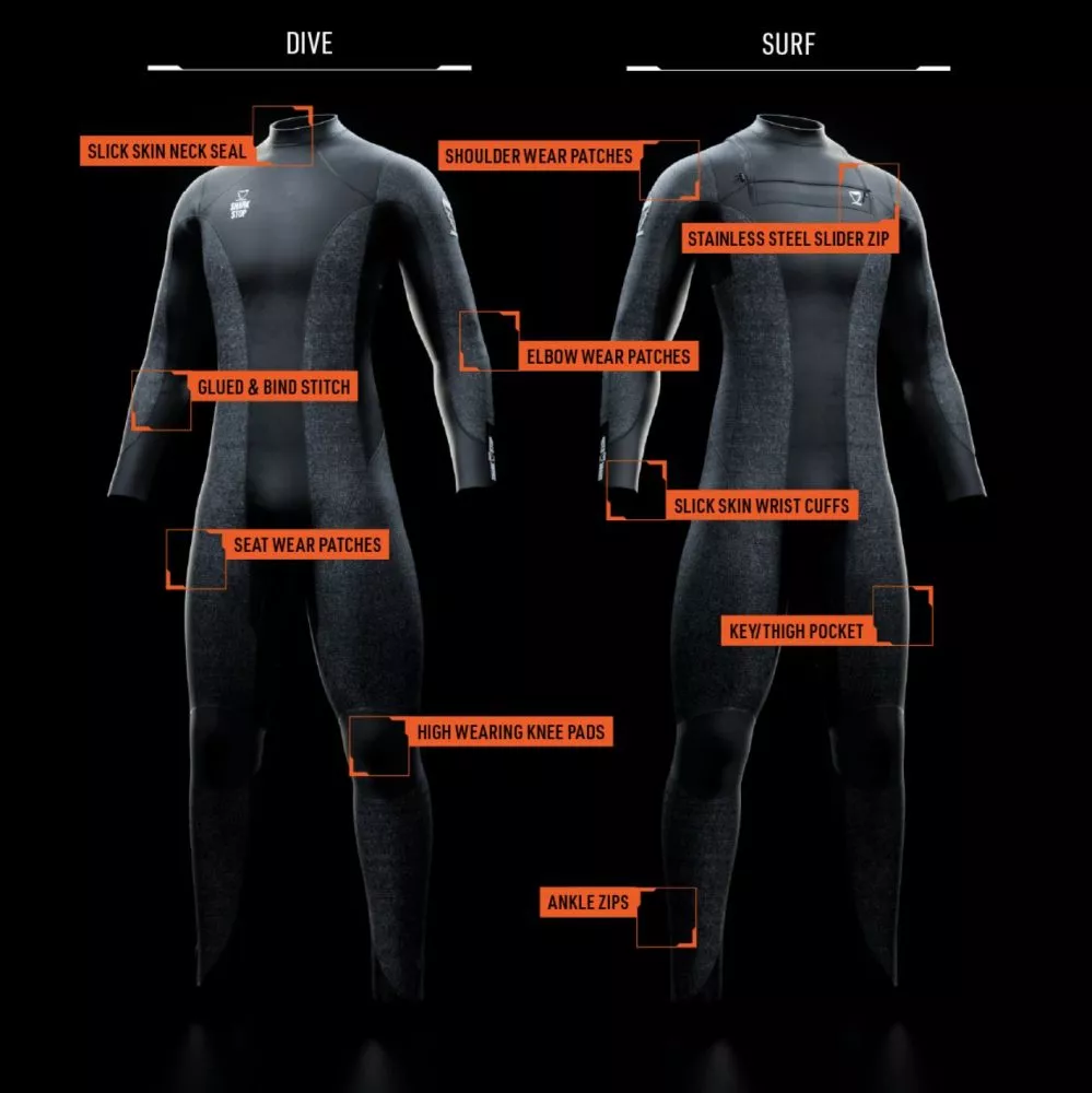 Les ingénieurs à l’origine de ce projet pensaient pouvoir fabriquer cette tenue de protection avec du Kevlar, une fibre synthétique incroyablement solide, mais ont dû renoncer en raison de son poids, incompatible avec la pratique de sports maritimes. Ils ont finalement opté pour le polyéthylène de masse molaire très élevée (UHMPE), un matériau plus léger et pourtant plus adapté, puisque son potentiel anti-abrasif est jusqu’à 15 fois plus important que celui de l’acier. Un avantage qui explique qu’il soit déjà utilisé pour produire des gilets pare-balles et autres accessoires militaires.