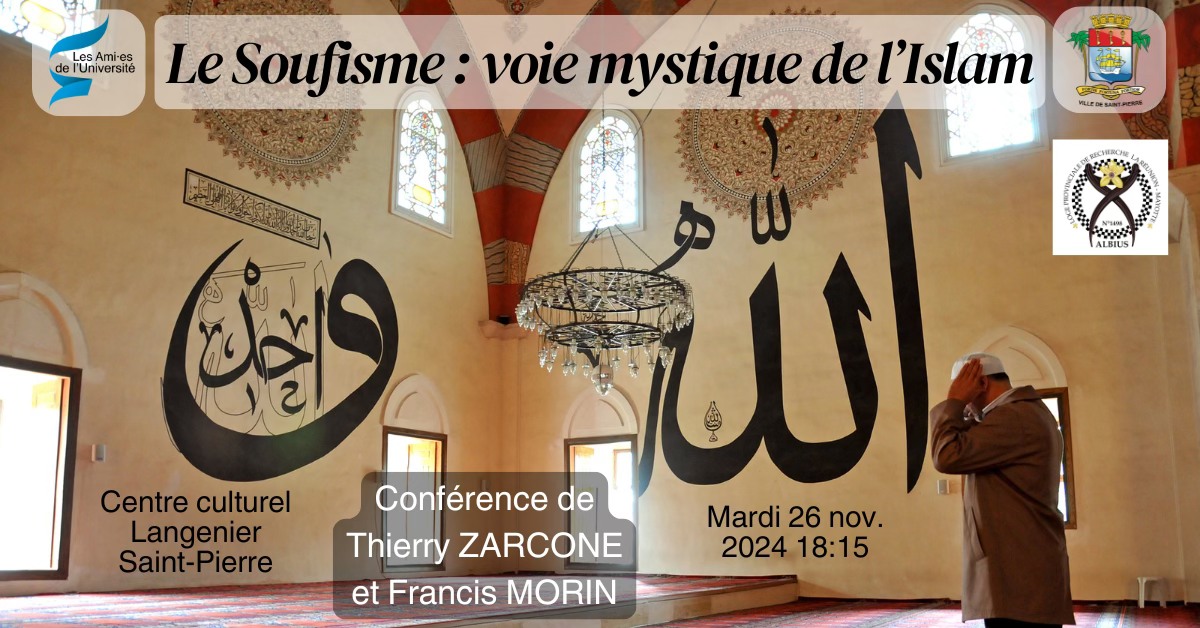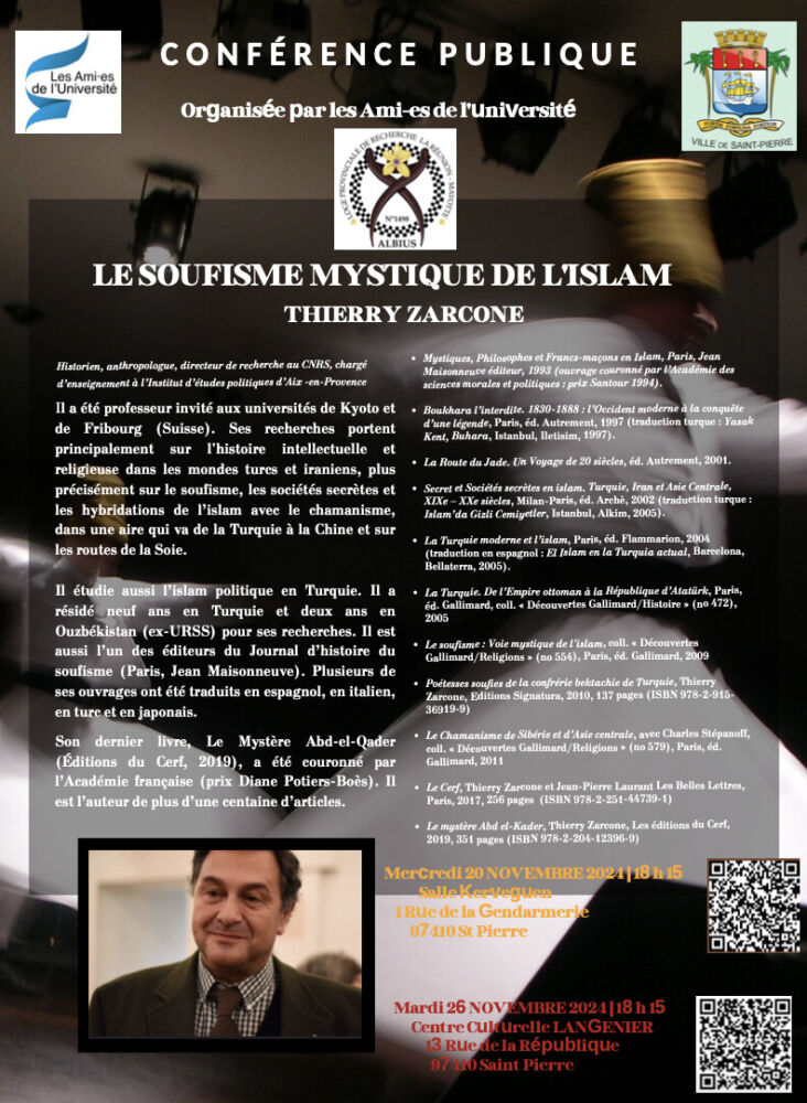 A l’invitation des Ami.e.s de l’Université, Thierry Zarcone, historien et anthropologue, directeur de recherche au CNRS, chargé d’enseignement à l’Institut d’études politiques d’Aix-en-Provence, va donner une conférence à La Réunion, sur le thème: « Le soufisme mystique de l’Islam ». Rendez-vous mercredi 20 et mardi 26 novembre à Saint-Pierre au centre culturel Lucet Langenier.