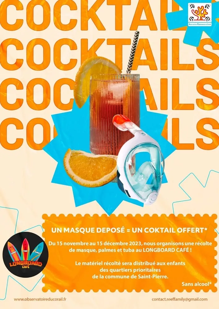 Déposez vos vieux masques, palmes et tubas au café et recevez un cocktail sans alcool en remerciement! Le matériel collecté ira aux enfants des quartiers prioritaires de la commune de St-Pierre, encourageant leur amour de l’océan.