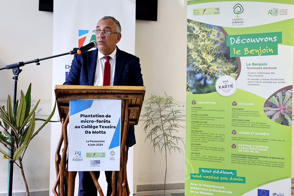 Face aux collégiens aux mains vertes, leurs enseignants, leurs parents d’élèves, le principal du Collège et les représentants des partenaires dont le Conservatoire botanique national de Mascarin, Gilles Hubert a indiqué : « Il est heureux de faire le parallèle entre votre action et celle que le Département soutient en faveur de la Ville de la Possession, puisque nous finançons la plantation de 15 000 arbres à l’échelle de la commune, dans une volonté d’accompagner la végétalisation des quartiers. Les projets portés au sein des collèges permettent à la fois de vous associer dans cette dynamique globale, mais aussi de sensibiliser les familles sur l’importance de sauver notre biodiversité si unique et si précieuse« .