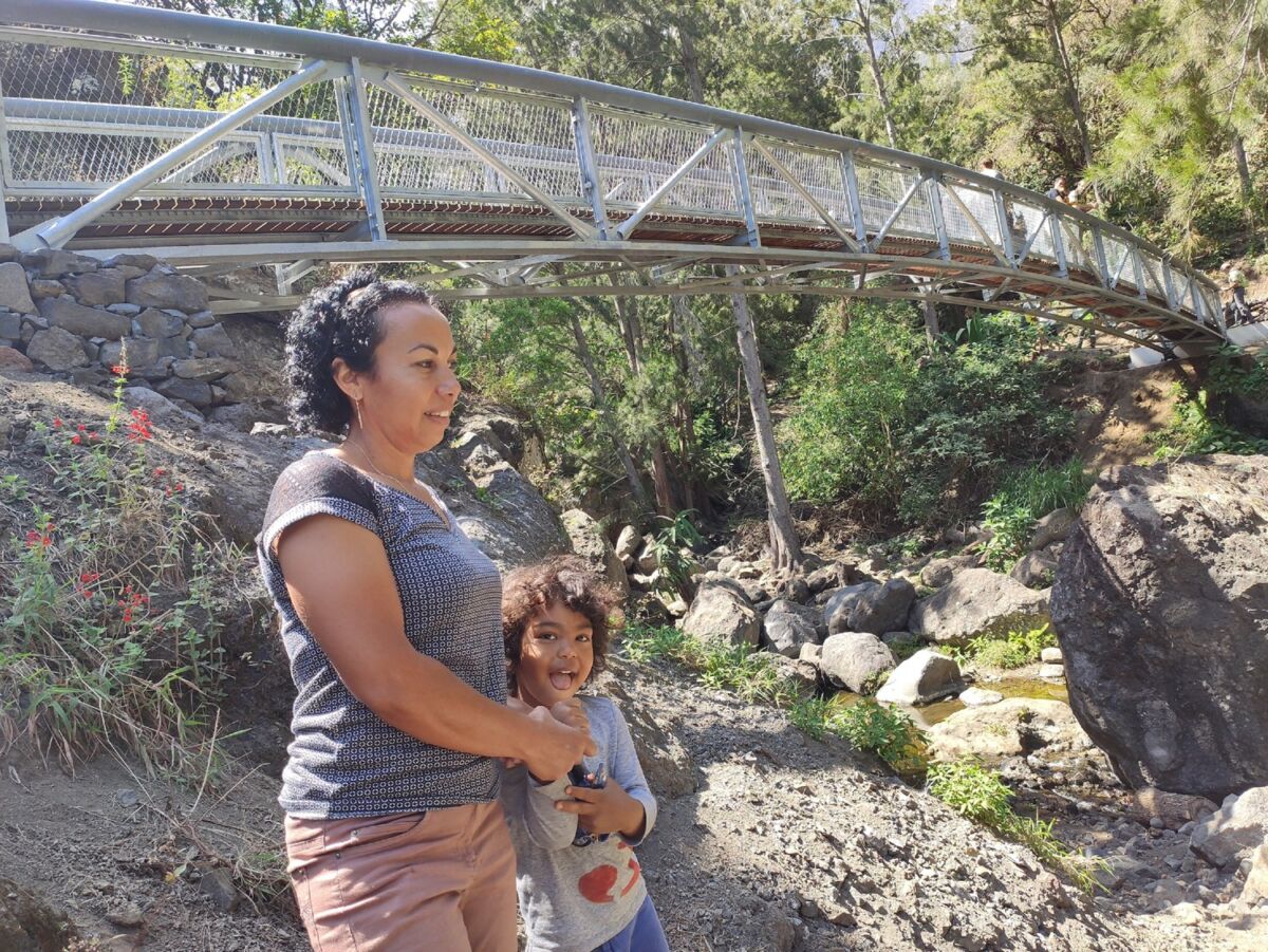 Denise et son fils Kevin, habitants de l’Îlet à Bourse au cœur du cirque de Mafate se réjouissent de la construction d’une nouvelle passerelle permettant de traverser en toute sécurité le Bras d’Oussy. « Avant, quand on voulait aller àGrand Place pour se rendre à la boulangerie, visiter la famille ou aller à la messe à l’église de Cayenne, on devait descendre dans le fond de la rivière.C’était dangereux et quand il pleut, on ne peut pas passer. Lors des cyclones, les îlets sont coupés du monde pendant des semaines entières. Cette passerelle nous change la vie » sourit Denise.