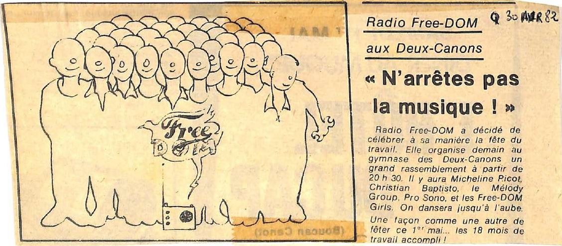 1982 Une nouvelle soirée dansante au gymnase des Deux Canons à St-Denis par La Rédaction 30 avril 1982 1 min de lecture Avec Micheline Picot, Christian Baptisto, le Melody Group, Pro Sono et les désormais célèbres Free Dom Girls. Ne manquez pas toute l’actualité de La Réunion ! Abonnez-vous à la newsletter de Free Dom ! Valider Partager Facebook Twitter Pinterest Linkedin Whatsapp Reddit Email Vous pourriez être intéressé par 10 décembre 1982 Un canular par jour sur Radio Free Dom 11 octobre 1982 L’émission « pas de canard sans navet » 7 octobre 1982 L’émission « bleu outre-mer ou la radio de la méduse… » La Rédaction Laisser un commentaire Annuler la réponseYour email address will not be published. Enregistrer mon nom, mon e-mail et mon site dans le navigateur pour mon prochain commentaire. Current ye@r * Leave this field empty Article précédent Tombola et Football Article suivant Free Dom invente la « manifestation dansante » pour le 1er mai (gymnase des Deux Canons) Articles récents... Mercredi 31 décembre 2025 – Météo, éphéméride et horoscope du jour Hommage à Johnny Hallyday sur Free Dom 2 ce 5 décembre Mardi 30 décembre 2025 – Météo, éphéméride et horoscope du jour Saint-Joseph : découverte de 2337 plants de cannabis, arrestation de 2 individus Point sur le réseau routier départemental, 29 décembre à 16H30 Suicide sur le pont de la Rivière d’Abord : importante mobilisation des secours et des forces de l’ordre Radier submergé à Ilet Furcy : la route de Cilaos fermée à la circulation cette nuit Fortes pluies : appel à la plus grande prudence à Saint-Paul Saint-Gilles-les-Bains : une route impraticable, les riverains montent au créneau (VIDEOS) Très grands excès de vitesse : un délit passible de prison depuis le 29 décembre 2025