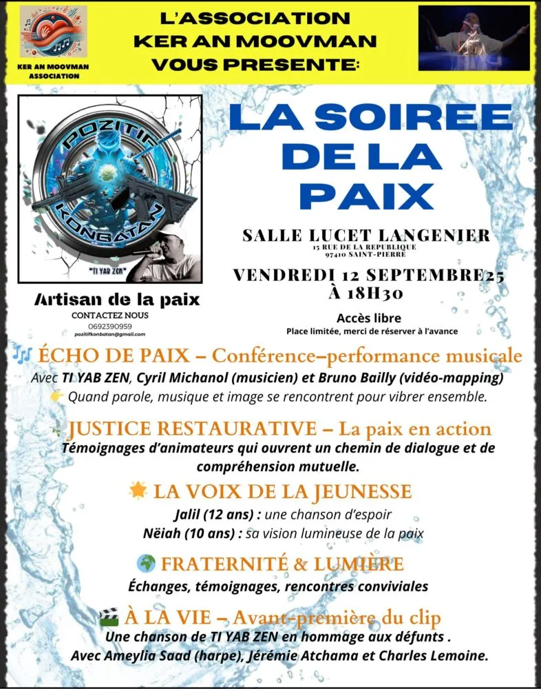 Il s’agit d’un événement qui aura lieu le vendredi 12 septembre à 18h30 au Centre Culturel Lucet Langenier à Saint-Pierre : la Soirée de la Paix, organisée avec l’association Ker An Moovman.