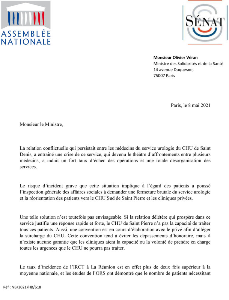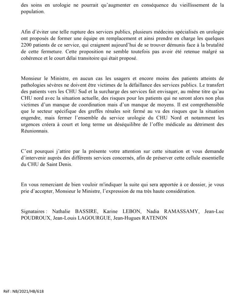 A l’initiative de la députée Nathalie Bassire, des parlementaires élus à La Réunion co-signent un courrier adressé au ministre de la Santé, Olivier Véran concernant notamment la situation de l’Urologie du CHU de Saint- Denis :