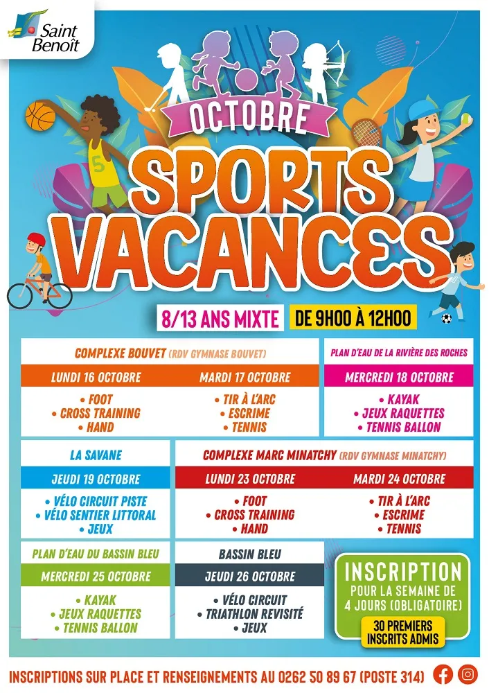 Pendant les ‘, la Ville de Saint-Benoît, par le biais de la Direction des sports, propose des activités sportives gratuites (football, handball, kayak, tennis…) aux enfants âgés de 8 à 13 ans.