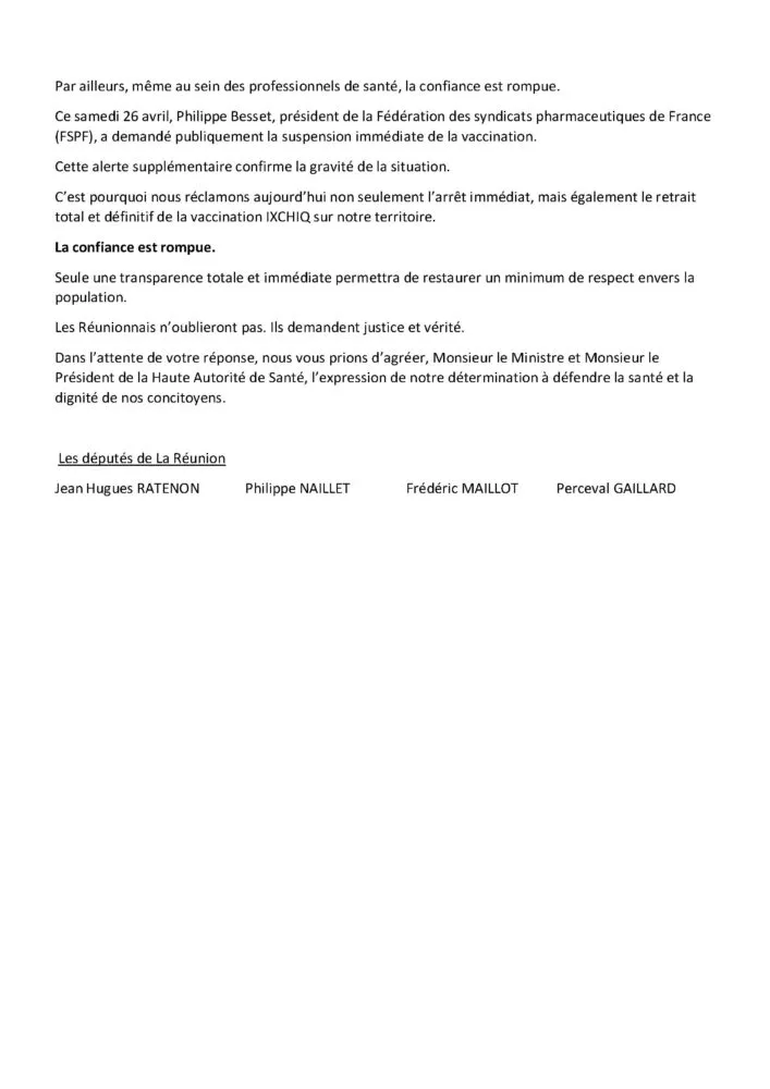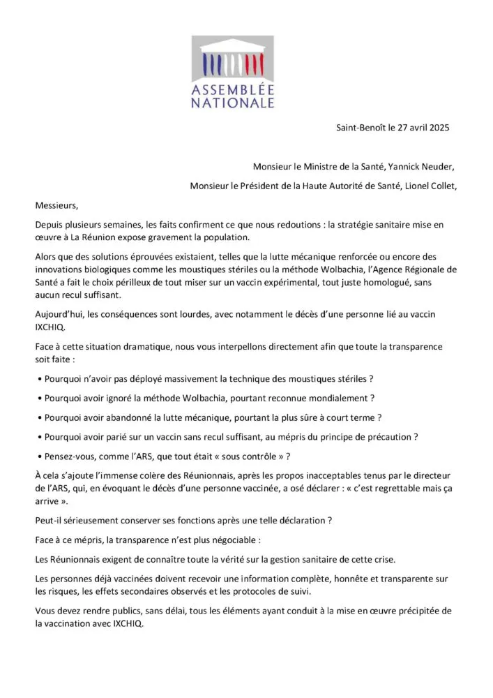 Face à un événement tragique lié au vaccin IXCHIQ, les députés réunionnais Jean-Hugues Ratenon, Philippe Naillet, Frédéric Maillot et Perceval Gaillard ont pris l’initiative d’interpeller directement le Ministre de la Santé, Yannick Neuder, et le Président de la Haute Autorité de Santé, Lionel Collet.