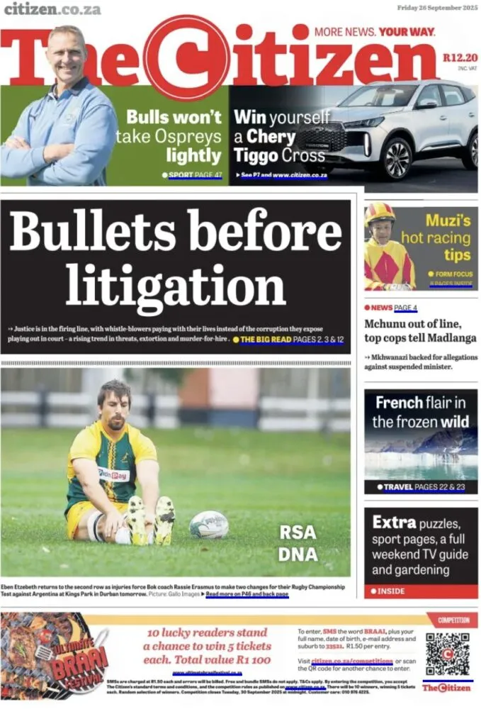 • The Citizen – Une Une marquée par la violence : « Bullets before litigation » – Les lanceurs d’alerte payent souvent de leur vie en Afrique du Sud, dans un climat de menaces et de meurtres liés à la corruption.