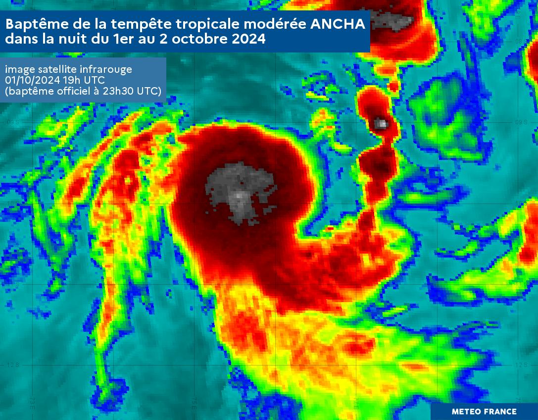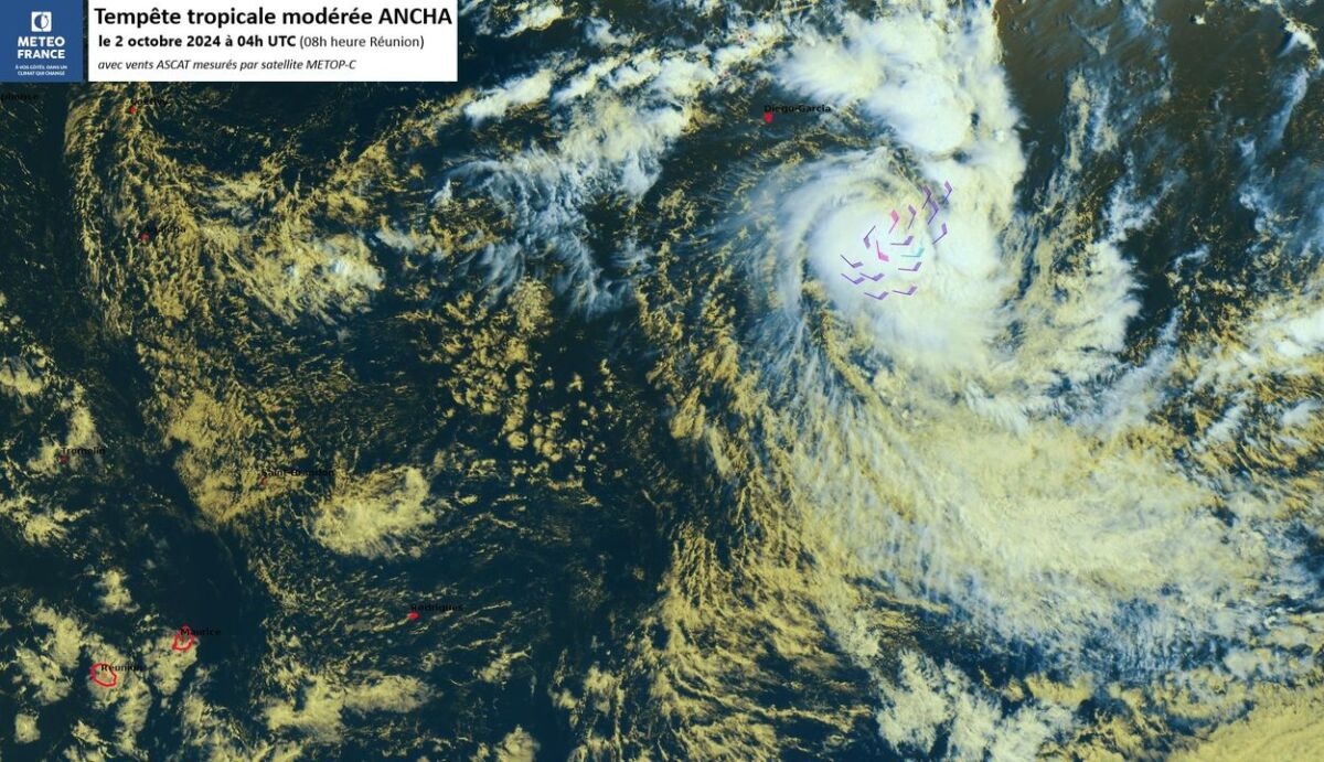 La tempête tropicale ANCHA, première du bassin Sud-Ouest de l’océan Indien pour la saison 2024-2025, a été baptisée le 1er octobre au soir. Elle a atteint son intensité maximale entre le matin du 2 octobre et la nuit suivante, flirtant avec le seuil d’une forte tempête tropicale. Une réanalyse déterminera si elle a dépassé ce stade.