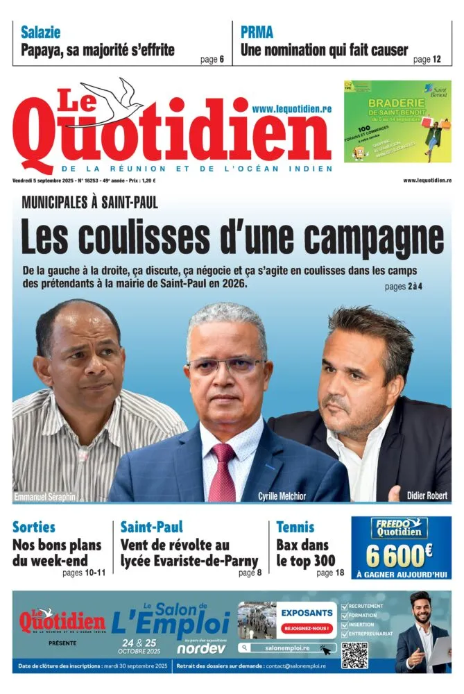 Températures : Saint-Denis 20°/27°, Saint-Pierre 19°/26°, Cilaos 10°/21°, Plaine-des-Palmistes 11°/17°, Maïdo 6°/14°