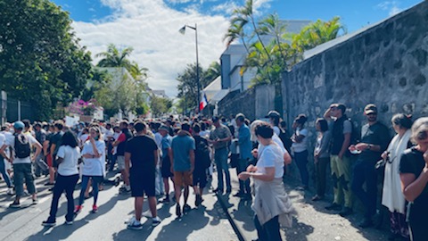 Ce matin, plusieurs dizaines de personnes se sont rassemblées à hauteur du rond-point McDo ce matin. Les forces de l’ordre sont sur place. Les manifestants se sont ensuite rendus devant la sous-préfecture de St-Pierre.