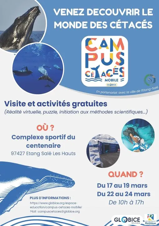 Du 22 au 24 mars, de 10h à 17h, Globice Réunion vous invite à l’événement Campus Cétacés Mobile qui se déroulera au Complexe Sportif du Centenaire à L’Étang-Salé.