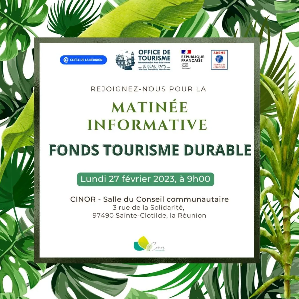 L’Office de Tourisme Intercommunal du Nord de La Réunion (OTI Nord) organise, en collaboration avec l’Agence de l’Environnement et de la Maîtrise de l’Énergie (ADEME) et la Chambre de Commerce et d’Industrie (CCI), une réunion d’information sur le Fonds Tourisme Durable et une présentation de l’opération « Le Grand Repas » 2023, le lundi 27 février 2023 de 9h00 à 11h00 à la Salle du Conseil communautaire de la CINOR (3 rue de la Solidarité, 97490 Sainte-Clotilde).