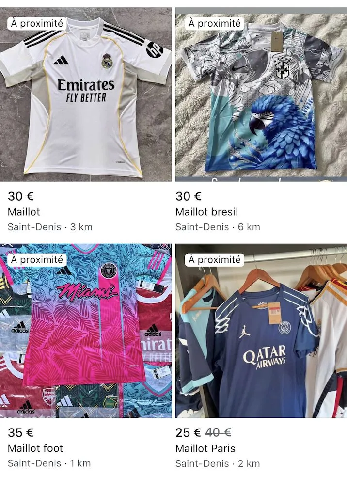 Mais les contrôles ne se limitent pas aux marchés physiques. Les forces de l’ordre et les agents de la DGCCRF (Direction générale de la concurrence, de la consommation et de la répression des fraudes) investissent également les réseaux sociaux, les groupes privés et les plateformes de petites annonces. En quelques clics, il est possible de trouver sur le Marketplace de Facebook des dizaines de maillots — Real Madrid, PSG, Brésil, Inter Milan… — vendus entre 20 et 35 euros, contre 80 à 150 euros pour un produit officiel.