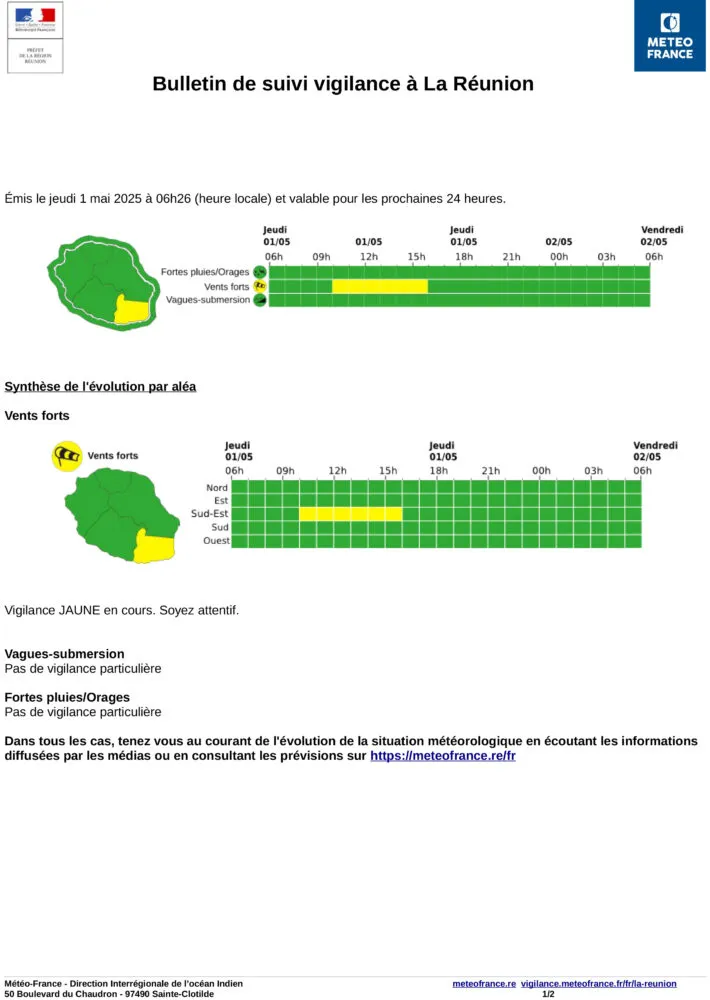 Actualités Vigilance jaune pour vents forts attendue dans le sud-est de 10h à 16h par Céline Hardelain 1 mai 2025 1 min de lecture Météo France annonce des vents forts ce jeudi 1er mai 2025 dans le sud-est de l’île. L’alerte de vigilance JAUNE est en cours de 10h à 16h locales. Soyez attentifs si vous circulez ou pratiquez des activités en extérieur. Ne manquez pas toute l’actualité de La Réunion ! Abonnez-vous à la newsletter de Free Dom ! Valider Partager Facebook Twitter Pinterest Linkedin Whatsapp Reddit Email Vous pourriez être intéressé par 31 décembre 2025 Mercredi 31 décembre 2025 – Météo, éphéméride et horoscope du jour 30 décembre 2025 Mardi 30 décembre 2025 – Météo, éphéméride et horoscope du jour 29 décembre 2025 Saint-Joseph : découverte de 2337 plants de cannabis, arrestation de 2 individus Céline Hardelain Laisser un commentaire Annuler la réponseYour email address will not be published. Enregistrer mon nom, mon e-mail et mon site dans le navigateur pour mon prochain commentaire. Current ye@r * Leave this field empty Article précédent Jeudi 1er mai 2025, météo, éphéméride et horoscope Article suivant Jeudi 1er mai (jour férié) : pas de collecte des déchets et fermeture des déchèteries et de la fourrière animale Articles récents... Mercredi 31 décembre 2025 – Météo, éphéméride et horoscope du jour Hommage à Johnny Hallyday sur Free Dom 2 ce 5 décembre Mardi 30 décembre 2025 – Météo, éphéméride et horoscope du jour Saint-Joseph : découverte de 2337 plants de cannabis, arrestation de 2 individus Point sur le réseau routier départemental, 29 décembre à 16H30 Suicide sur le pont de la Rivière d’Abord : importante mobilisation des secours et des forces de l’ordre Radier submergé à Ilet Furcy : la route de Cilaos fermée à la circulation cette nuit Fortes pluies : appel à la plus grande prudence à Saint-Paul Saint-Gilles-les-Bains : une route impraticable, les riverains montent au créneau (VIDEOS) Très grands excès de vitesse : un délit passible de prison depuis le 29 décembre 2025